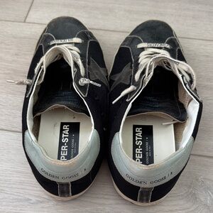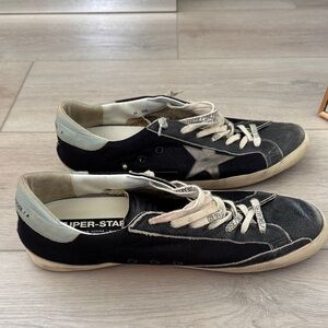 Stylish Golden Goose sneakers. Black upper with cream details. Signature star design. Casual and trendy.