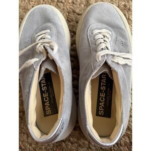 Authentic Golden Goose Space-Star men’s sneakers in the sought-after ice-gray suede with perforated star detail. Gently worn and in excellent condition. Suede is clean and soft with one minor scuff on one shoe (not yet treated and likely removable). Insoles and soles are in great shape.