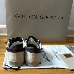 Stylish Golden Goose sneakers with a white base and gray accents. Perfect for casual wear.