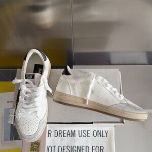 The laces are pure white, matching the main color of the upper. The upper retains the brand's signature mottled, distressed texture, complemented by a yellowed sole edge.