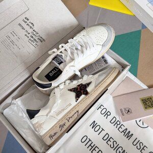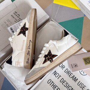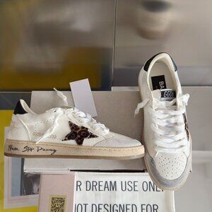 The toe box and side panels are crafted from light grey suede, with leopard print stars adorning the sides.