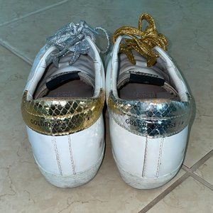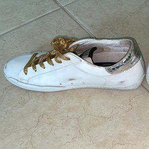 Golden Goose distressed leather sneakers with signature suede star at side.