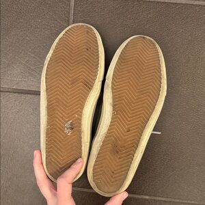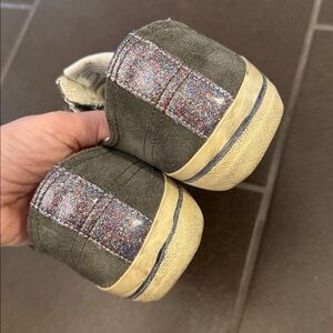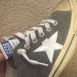 WORN ONCE!! Stylish Golden Goose sneakers with a worn-in look. Olive/grat body with cream accents. Perfect for casual wear.