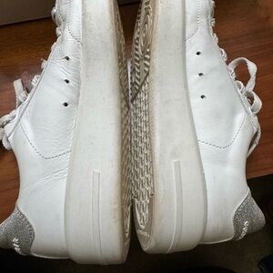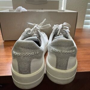 Stylish white sneakers with a classic design. Features the Golden Goose logo.  Comes with box, authentication papers, dust bag and of course shoes.  These shoes are very comfortable.  See images for details and wear notes.   Size 36/6.  I have not tried to clean them up.   Smoke free home.