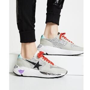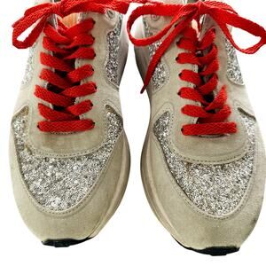 Golden Goose Quincy Running Sneakers Glitter Silver Size 38 Red Lace Italy