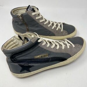 Golden Goose Slide leather high-tops in dark grey with light grey suede & black leather detailing - classic old-school hi-top style with Slide inner side zipper. The GGDB style is of course deliberately distressed, as these are to an extent, but overall they’re in great shape and have even had the heel professionally re-heeled. Solid! Check out all the pics (and I can take any others you like). Euro size 45 which is US size 12 equivalent.