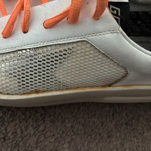 Made to look worn and vintage. Bright orange laces with gold and silver star accents. Have a lot of glue showing throughout but I think it blends in with the look of the sneakers. Worn condition and no dust bag.