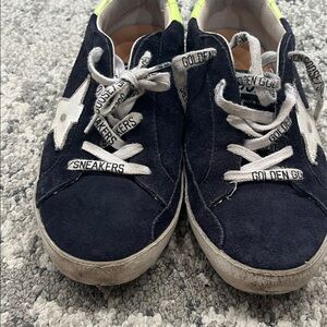 Chic Golden Goose sneakers in dark blue with bright yellow accents. Features signature star and branded laces.