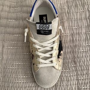 The sneakers showcase Golden Goose’s signature black suede star patch, contrasting royal blue heel tab, and intentionally hand-worn detailing across the sole for the label’s instantly recognizable lived-in look. A cushioned insole and durable rubber outsole complete the design, offering both comfort and cool street-style appeal.