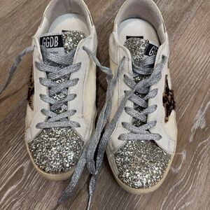 The product is a pair of Golden Goose Superstar sneakers in size 38 (excellent condition) specifically designed for women. These athletic shoes are in excellent used condition and come in the original box with dust bag. The sneakers are in a stylish white colorway including cheetah print star and hot pink soles.