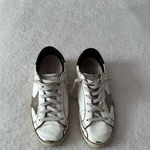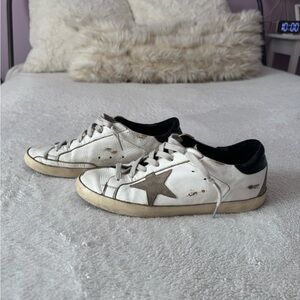 Golden Goose Sneakers that are a bit worn but in good condition. I’m selling them since they aren’t what I usually grab for anymore. Very comfortable, doesn’t come with a box but comes in a the Real Real bag since that’s where I got them from! these also aren’t the OG laces!