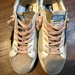 Golden Goose multicolored Superstar sneakers. Mesh with leather and suede. The brown is more tan in person. Intentionally distressed. Excellent used condition. Please check all photos closely. Purchased at Nordstrom, comes with the box and dustbag.