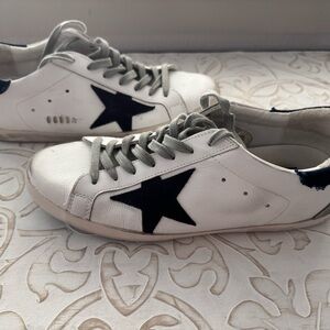 Step into style with these iconic Golden Goose Superstar sneakers. Known for their distinctive distressed look, these sneakers feature a white leather body with a striking black star and navy accents. The scuffed style is intentional, adding to their streetwear vibe. They come with a comfortable leather interior and are perfect for those who love a mix of luxury and casual.