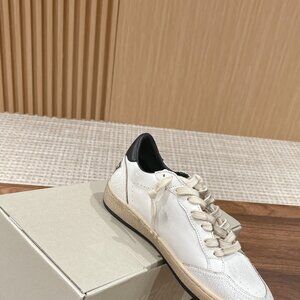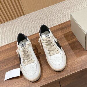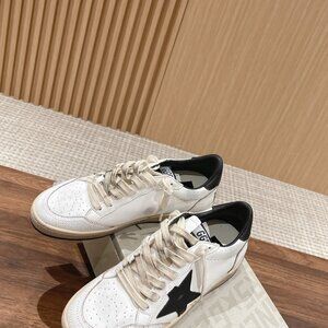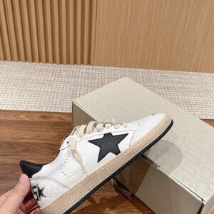 These Golden Goose sneakers feature a white leather upper with a distinctive black star logo on the side, embodying a chic distressed aesthetic. The shoes are designed with a pre-worn look, complete with white laces, offering a blend of casual streetwear and luxury style. Perfect for those who appreciate a unique, vintage-inspired design.