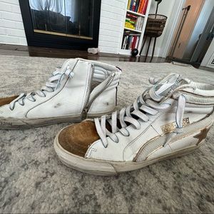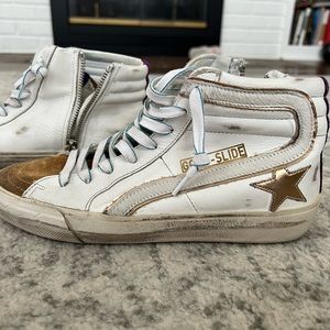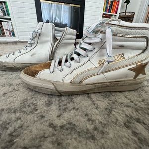 Stylish high-top sneakers. White leather with gold star detail. Lace-up design with side zipper.