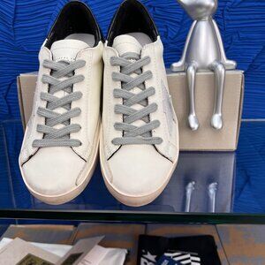 Embrace the vintage aesthetic with Golden Goose sneakers, featuring a white leather base and light grey suede star logo. These low-top sneakers are designed with a deliberately distressed look, complete with grey laces and an off-white sole for a timeless appeal.
