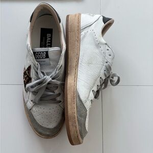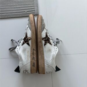 Golden Goose sneakers. White and gray with leopard print detail. Perfect for casual wear. These were bought worn in at gg store have box and receipt