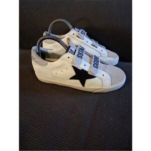 Chic Golden Goose sneakers with white and tan design. Features velcro straps for easy wear.