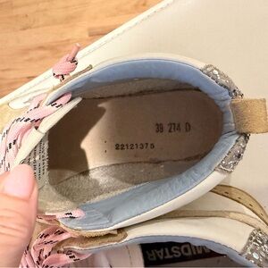 Golden Goose sneakers in white and tan. Features pink laces and silver star detail. Unique text on sole size 39
