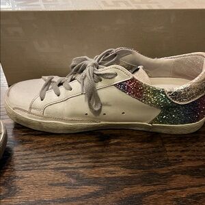 Golden Goose sneakers with rainbow glittery accents. Features star design and lace-up style. These are so fun and unique - have not seen them anywhere else! Size 7 and in excellent condition. Distressed style, but only very lightly worn. Photos accurately display condition