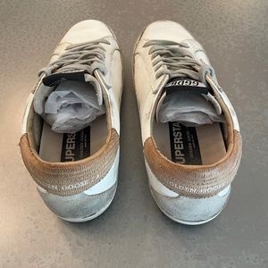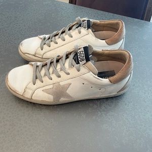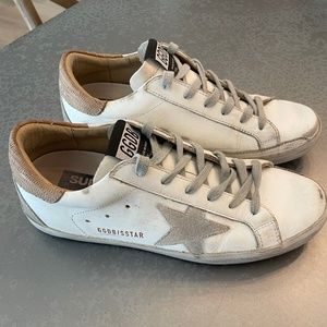 Stylish Golden Goose sneakers. Features white leather with gray accents. Iconic star design on the side.