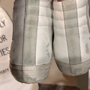 Like Brand New! Wore once! ( Around the inside of the house) Ordered directly from Golden Goose Website and shipped from Italy...not from retail store. Golden Goose shoes comes with carrying bag, passport (scan QR code for other products), and the original shoe box. Style: Slide Classic Material: Suede toe and star leather quarter and wave color: White/ ice