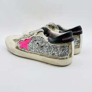 Chic Golden Goose sneakers with a vibrant pink star. Glittery sides add sparkle. Stylish and unique.