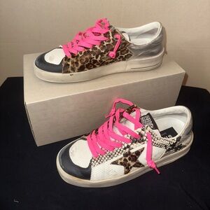 Leopard and snake print sneakers with bright pink laces. Unique and eye-catching design.