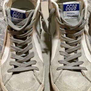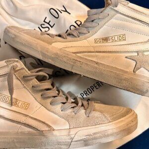 Size 38. These were bought directly from Golden Goose; however, my daughter has only worn them about two times. Too expensive to sit in the closet so a great deal ( practically brand new) for someone wanting this brand/ style. The zipper on them is still stiff because she did not wear them. The shoestrings are a light gray. The sneakers come with a box, passport, bag, and insert stating it is an authentic golden goose product. Upon purchase, I mail the same day or the following day. Smoke free home.