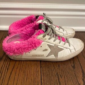 Golden Goose sabot mule sneaker with neon pink fur. Sold out everywhere.