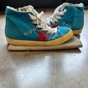 Bright turquoise high top sneaker with red star. They have been worn only once! Silver leather detail