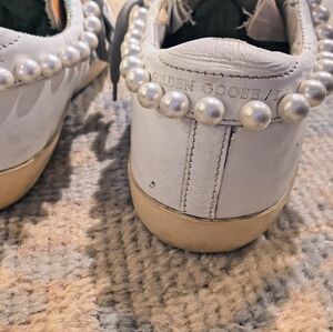 Well loved! These were my favorite GGs for a long time so there is wear throughout, on soles, tongue, exterior leather as shown. Also note, two pearls are replaced on the left shoe with different pearls (see photo 8 + 9) All other pearls are original and intact. See photos 3-12 for exact condition.