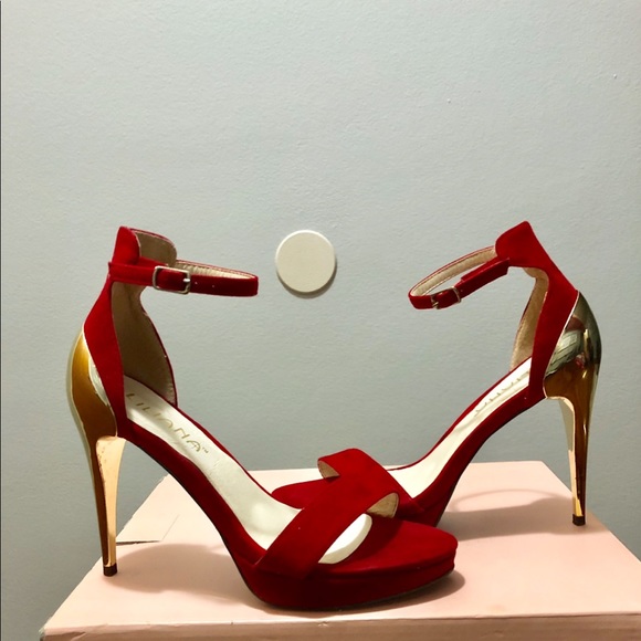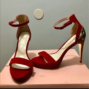 Fair condition red heels with a little platform for comfort. Front straps were rained on so some spots are darker than others but as you can see from the pictures, it’s not very noticeable. No scratches or faults on heel. Size 7.5.