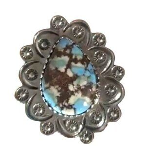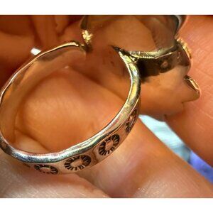 In the heart of the artisan's workshop, this ring was forged with passion. The Golden Hills Turquoise, a gem of the heavens, rests elegantly, capturing the azure sky and earthy veins of its origins. Each sunburst on the sterling band whispers tales of ancient desert landscapes, making this ring a timeless piece of art and nature combined.