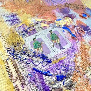 It features dramatic purple and copper acrylic paints along with exotic papers, international postage stamps, interesting sand and resin textures punctuated with blue and gold shimmer foil. There is a lot to explore in this artwork that will keep you coming back to discover more.