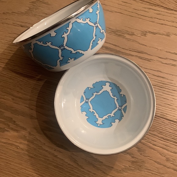 Set of two Enamel Golden Rabbit Bowls. White enamel with sky blue damask design. So pretty! Great for camping, picnics, trinkets.