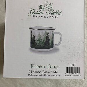 A Golden Rabbit Enamelware Forest Glen pattern mug. Never used and is original box. Size is 4.75" in diameter and 3.75" in height. Mug can hold 24 ounces.