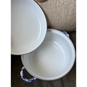 Golden Rabbit cobalt swirled enameled pot measuring 9” in diameter (without handles), 3 5/8” tall (without lid), and with lid about 5 1/2” tall. I believe this is the 4 qt. Super clean inside and out