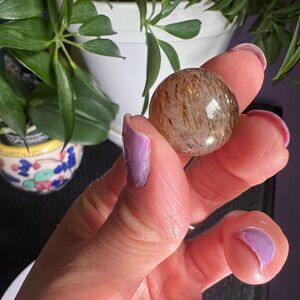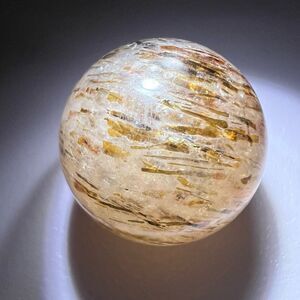 A golden rutilated quartz marble sphere glistens with golden threads, each rutile inclusion capturing light in a mesmerizing display. Metaphysically, it is said to amplify energy, enhance intuition, and promote spiritual growth, offering clarity and a deeper connection to one's inner self.
