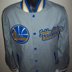 NBA GOLDEN STATE WARRIORS 4 TIME NBA FINALS CHAMPIONSHIP JACKET. (This is 4 Time not 6 Time Champ, it still is beautiful) Cotton jacket with sewn patches of the Years the WARRIORS won on the sleeves. Color: GRAY jacket with BLUE & YELLOW Trim. The jacket has 2 exterior pockets & 2 inside pockets. Inside lining is polyester. This is a lighter to medium weight jacket. All the logos are meticulously sewn on. There is no polyfilling. Measurements armpit to armpit M:24" L:25" XL:26.5 2X: 27.5