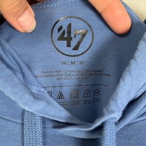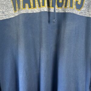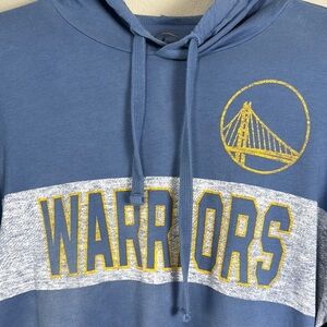 Blue hoodie featuring Golden State Warriors logo and text in gold and white.