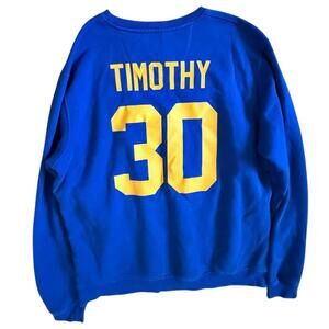 Royal blue Warriors crewneck with front logo and custom “Timothy 30” print on the back. Official NBA Store piece.