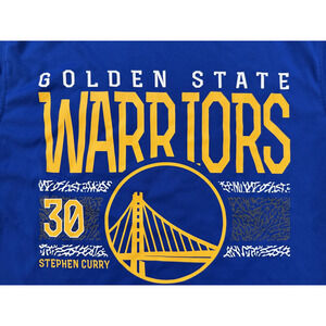 Front graphic: Golden State Warriors wordmark with bridge logo, Stephen Curry and number 30