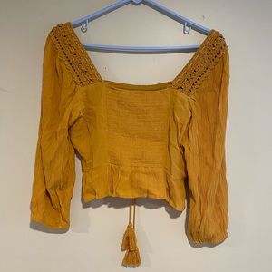 Beautiful golden yellow cropped 3/4-length sleeve blouse from American Eagle. It has lovely embroidered detail and tassels!! Gauzy material that it is great for when the weather starts to get warm! Super pretty and in great condition I just don’t wear it that much! Size S, true to size or a little big in my opinion as I’m sometimes between a small/medium.
