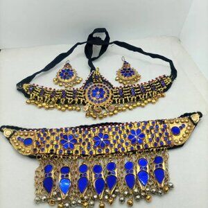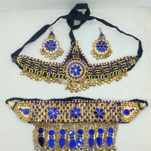 This stunning tribal jewelry is handcrafted by indigenous of South Asia. Their talent and creative skills are truly portrayed through this marvelous tribal jewelry. More than just colors. Delicate dreamy blue glass stones add an extra sparkling look to this vintage jewelry set. This pretty golden tribal jewelry set contains an elegant choker, a pair of tantalizing earrings and a glamorous headpiece.