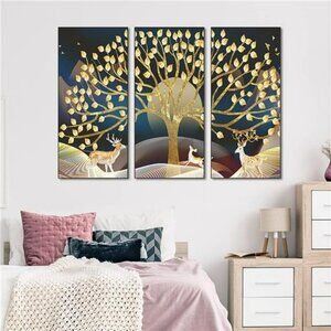 🧿Golden tree wall sticker size: The package comes in roll with 3 sheets which includes a large golden tree and three deer. The product received size will be 24 inches x 11.6inches for each sheet.