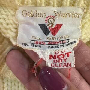 This vintage Golden Warrior sweater is a unique find! Featuring a stylish zig-zag Fair Isle pattern in cream and brown tones, this acrylic sweater is perfect for adding a touch of retro charm to your wardrobe.