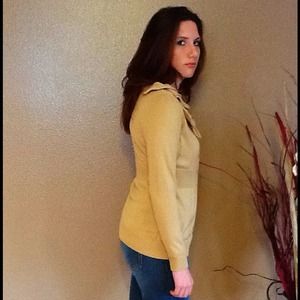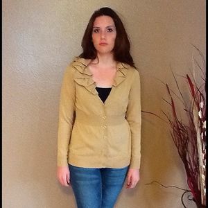 Golden bronze sweater with ruffled detail around the collar. Slightly cinches in around waist with ribbed design.