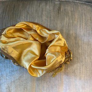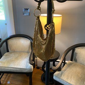 Metallic gold shining hobo-type evening handbag with matching lipstick carrier.
