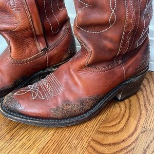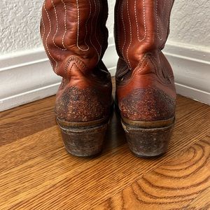 Fit true to size 37, US size 7. Red/brown color. Beautifully distressed. Have been stored with shoe horns, conditioned. Missing a leather pull for one of the zippers.